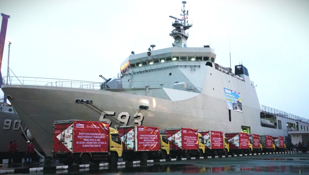 Dua truk juga disalurkan melalui Yonmarhanlan III Jakarta dengan KRI TNI AL menuju pelabuhan Belawan, Sumut pada Jumat lalu (28/11/2025).